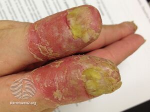 | Other names: Acrodermatitis perstans, Pustular acrodermatitis, Acrodermatitis continua of Hallopeau, Acrodermatitis continua suppurativa Hallopeau, Hallopeau's acrodermatitis, Hallopeau's acrodermatitis continua, Dermatitis repens Crocker | |