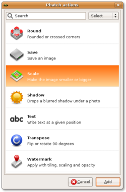 Typical actions include resizing, rotating, cropping, converting, applying shadows, rounded corners, perspective, reflection, and converting between different image formats.[2] Phatch can also be used to rename or copy image files based on the Exif or IPTC Information Interchange Model tags.