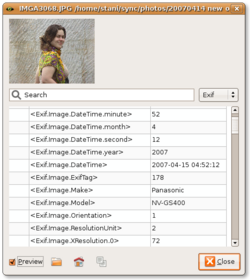 The image inspector can be used to explore the metadata tags stored in images. The tabs can be passed to any action, which is especially useful for renaming or copying files, but also for data-stamping such as date, time, aperture or shutter speed on the picture. Multiple inspectors can be opened at once to compare tag values with a preview of the image.