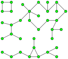 A component of a given undirected graph may be defined as a connected subgraph that is not part of any larger connected subgraph. For instance, the graph shown in the first illustration has three components. Every vertex [math]\displaystyle{ v }[/math] of a graph belongs to one of the graph's components, which may be found as the induced subgraph of the set of vertices reachable from [math]\displaystyle{ v }[/math].[1] Every graph is the disjoint union of its components.[2] Additional examples include the following special cases: