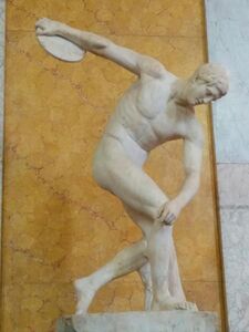 A discus thrower performs an isometric press by applying downward pressure onto his bent right leg. This allows the throw to be performed more powerfully.