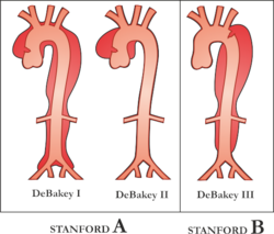 Should initial medical management fail or there is the involvement of a major branch of the aorta, vascular surgery may be needed for these type B dissections. Treatment may include thoracic endovascular aortic repair (TEVAR) with or without extra-anatomic bypass such as carotid-carotid bypass, carotid-subclavian bypass, or subclavian-carotid transposition.[14]