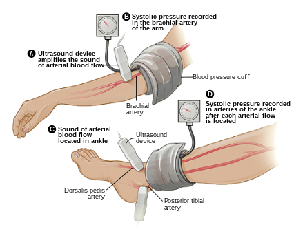 ABI testing is used by vascular surgeons in the diagnosis of PAD. The blood pressure in the arm and leg are compared as a ratio.