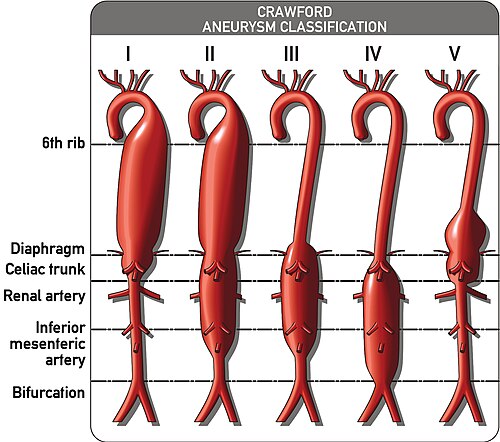 Thoroacoabdominal aneurysms are those which span the chest and abdominal cavities. The Crawford classification was developed and describes five types of thoracoabdominal aneurysms.[9]