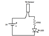 A basic circuit using a tilt sensor is shown here. For this assembly, the components used are: a tilt sensor, a 470 Ohms resistor, a LED and a 3V power supply.