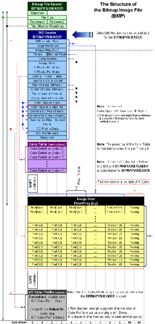 | ICC color profile | Yes | Variable size | To define the color profile for color management | Can also contain a path to an external file containing the color profile. When loaded in memory as "non-packed DIB", it is located between the color table and Gap1.[6] |