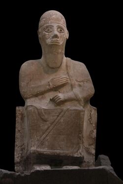 "Ishara of the king", a hypostasis meant to serve as a protector of the reigning Eblaite monarch, was worshiped in the temple of the city god Kura.[130] A statue of the royal hypostasis of Ishara was placed inside, and she could receive offerings in this building.[129] However, a separate temple dedicated to her existed in Ebla too.[4] Administrative texts indicate that multiple members of the Eblaite royal family and court were devotees of Ishara.[131] Personal devotion to the royal aspect of Ishara is best documented among women belonging to the royal house, such as Dusigu, the wife of Irkab-Damu and Kešdutu, a princess who was eventually sent to marry the king of Kish.[30] As an extension of her role in the royal cult, Ishara was worshiped during rituals connected to weddings of kings.[57] During preparations for it, the future Eblaite queen was expected to make offerings to Ishara and Kura.[132] The king instead made offerings to her after the return from the ceremony, which took place outside the city.[133] In Darib near Ebla, possibly to be identified with modern Atarib, Ishara was invoked in connection with the funerary cult of deceased Eblaite kings, alongside a god associated with this locality whose name is not preserved and the divine pairs of Hadabal and his nameless spouse, Resheph and Adamma and Agu and Guladu.[134] A form of Ishara linked to king Kun-damu was worshiped by his successors.[57] She is still attested as late as thirty years after his death.[4] In addition to such hypostases linked to the royal family, specifically to individual kings and queens mothers, one linked to the vizier Arrukum is also attested.[57] Further hypostases, a pair consisting of "major" (MAḪ) and "minor" (TUR) Isharas, are attested in an inventory of weapons.[30]