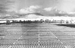The first practical use of the Marston mat was during the Carolina Maneuvers, a series of United States Army exercises held in November 1941. A 3,000 feet (910 m) by 150 feet (46 m) airstrip was constructed of the material near Camp Mackall in the area of Marston, North Carolina. Installation of the airstrip was completed in 11 days. The completed airstrip was visited by General Henry H. Arnold, then Chief of the Army Air Corps, who called it “the year’s greatest achievement in aviation warfare.” The airstrip was dismantled immediately after the exercises and the component mats moved by rail to Langley Field.[3][5]