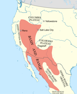 The Basin and Range Province includes much of western North America. In the United States, it is bordered on the west by the eastern fault scarp of the Sierra Nevada and spans over 500 miles (800 km) to its eastern border marked by the Wasatch Fault, the Colorado Plateau and the Rio Grande Rift. The province extends north to the Columbia Plateau and south as far as the Trans-Mexican Volcanic Belt in Mexico, though the southern boundaries of the Basin and Range are debated.[2] In Mexico, the Basin and Range Province is dominated by and largely synonymous with the Mexican Plateau.