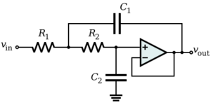 A popular circuit implementing a second order active R-C filter is the Sallen-Key design, whose schematic diagram is shown here. This topology can be adapted to produce low-pass, band-pass, and high pass filters.