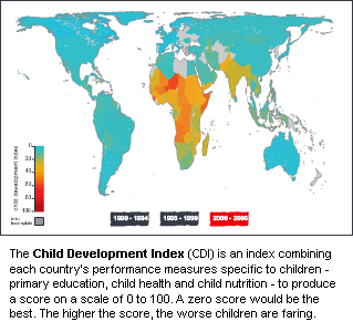 The Child Development Index (CDI) is an index combining performance measures specific to children—education, health and nutrition—to produce a score on a scale of 0 to 100. A zero score would be the best. The higher the score, the worse children are faring.
