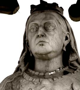This is a statue of the Queen in white marble ... The statue finds a place in a stone structure in the Decorated Gothic style, verging upon the Perpendicular. There are, so to speak, three stories. The lower one forms the pedestal. This is square, and has at each angle a granite shaft, surmounted by a lion rampant and shield. One of the panels bears an inscription stating the object and date of the monument. The second or principal story is an arched canopy, under which the statue stands, and this is supported by piers with granite shafts. The arches are decorated, and there are crocketed gablets and pinnacles, the centre of each gablet having a trefoiled panel, with the borough coat-of-arms. The upper story takes the form of a graceful spire. The height of the monument is 45 ft (13.72 m), and the base is 9 ft 6 in (2.90 m) square, the whole being enclosed by an ornamental railing. The statue is 6 ft 6 in (1.98 m) in height, and has been carved out of a block of Sicilian marble weighing 4½ tons. Her Majesty is represented standing with the sceptre in her right hand, and the pose is calm and dignified. She wears the Imperial crown, and is attired in a reception dress trimmed with lace. Upon her breast is the Order of the Garter and that of Victoria and Albert. Her necklace contains the famous Koh-i-Noor. The train of the dress is gracefully arranged, and the design generally is admirable. The more striking feature of the statue, however, is the faithful likeness of Her Majesty which the sculptor, Mr. Webber, has presented. He has evidently done his work in a conscientious manner, and the result must tend to enhance his reputation as a sculptor.[5]