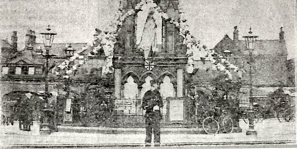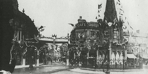 The monument was garlanded again on 22 June 1897, in celebration of Queen Victoria's diamond jubilee. In the morning, when the photograph (below) was taken, the temperature was 76 °F (24 °C) in the shade. There was a procession through the town, while all the church bells rang.[7]:136