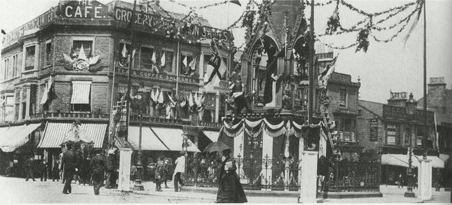 The monument garlanded for Victoria's diamond jubilee, 1897