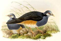 Today, five skins and a partial skeleton are kept in the American Museum of Natural History, while a single skin and the egg are kept at the Natural History Museum at Tring.[12][13] The Choiseul pigeon is also known as the Solomon crowned pigeon, Solomon Islands pigeon, Solomons crested pigeon, Solomon Islands crested pigeon, Choiseul crested pigeon, crested Choiseul pigeon, Meek's pigeon, Meek's ground pigeon, and dwarf goura.[14] The indigenous peoples of Choiseul called the species either "kumku-peka" or "kukuru-ni-lua", which translates literally as "pigeon-belong-ground".[9][13]