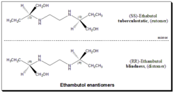 The antitubercular agent Ethambutol contains two constitutionally symmetrical stereogenic centers in its structure and exists in three stereoisomeric forms. An enantiomeric pair (S,S)- and (R,R)-ethambutol, along with the achiral stereoisomer called meso-form, it holds a diastereomeric relationship with the optically active stereoisomers. The activity of the drug resides in the (S,S)-enantiomer which is 500 and 12 fold more potent than the (R,R)-ethambutol and the meso-form. The drug had initially been introduced for clinical use as the racemate and was changed to the (S,S)-enantiomer, as a result of optic neuritis leading to blindness. Toxicity is related to both dose and duration of treatment. All the three stereoisomers were almost equipotent with respect to side effects. Hence the use of S,S)-enantiomer greatly enhanced the risk/benefit ratio.[51][52]