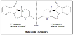 Thalidomide is a classical example highlighting the alleged role of chirality in drug toxicity. Thalidomide was a racemic therapeutic and prescribed to pregnant women to control nausea and vomiting. The drug was withdrawn from world market when it became evident that the use in pregnancy causes phocomelia (clinical conditions where babies are born with deformed hand and limbs). Later in late 1970s studies indicated that the (R)- enantiomer is an effective sedative, the (S)-enantiomer harbors teratogenic effect and causes fetal abnormalities.[53][54][55] Later studies established that under biological conditions the (R)-thalidomide, good partner, undergoes an in vivo metabolic inversion to the (S)-thalidomide, evil partner and vice versa. It is a bidirectional chiral inversion. Hence the argument that the thalidomide tragedy could have been avoided by using a single enantiomer is ambiguous and pointless.[56][57][58]