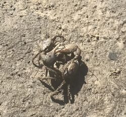 The fiddler crab or calling crab may be any of more than one hundred species of semiterrestrial marine crabs in the family Ocypodidae,[2] well known for their sexually dimorphic claws; the males' major claw is much larger than the minor claw, while the females' claws are both the same size.[3] A smaller number of ghost crab and mangrove crab species are also found in the family Ocypodidae. This entire group is composed of small crabs, the largest being slightly over two inches (5 cm) across. Fiddler crabs are found along sea beaches and brackish intertidal mud flats, lagoons, swamps, and various other types of brackish or salt-water wetlands.
