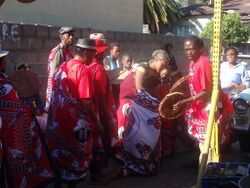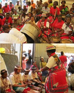 During the training period the ithwasa will share their ailments in the form of song and dance, a process that is nurtured by the analysis of dreams, anxieties, and with prayer. The story develops into a song which becomes a large part of the graduation-type ceremony that marks the end of the ukuthwasa training.[48] At times in the training, and for the graduation, a ritual sacrifice of an animal is performed (usually chickens and a goat or a cow).[49]