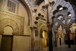 The oldest maqsura in the Islamic world to be preserved in situ is the wooden maqsura of the Great Mosque of Kairouan, commissioned by the Zirid ruler al-Mu῾izz ibn Badis and dating from the first half of the 11th century (though later restored in the 17th century). It is located directly to the right of the mosque's minbar, and is notable for its woodwork which includes an elaborately carved Kufic inscription dedicated to al-Mu'izz.[5][4] The preserved maqsura of the Great Mosque of Cordoba, although no longer part of a functioning mosque, is even older but represents a very different example. It dates from 965 during Caliph al-Hakam II's expansion of the mosque.[4] Rather than being situated to the side of the mihrab, the maqsura here occupied a rectangular area directly in front of and around the mihrab. Although no physical screen (if there was one) has survived, the area is marked off by the architecture of the arches around it, which differ from the rest of the mosque's arches and present an elaborate interlacing pattern which was highly influential in subsequent Moorish and Moroccan architecture. The area is also covered by three richly-crafted domes above.[4]