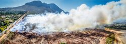 An aerial view of a controlled burn in Helderberg Nature Reserve in South Africa bordering the city of Cape Town. In South Africa controlled burns are important for maintaining the ecological health of indigenous fynbos as well as reducing the intensity of future burns.