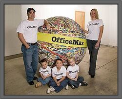 Steve Milton of Eugene, Oregon, previously held the record for the biggest rubber band ball beginning in 2006. During the construction of his rubber band ball, he was sponsored by OfficeMax, who sent him rubber bands to use for his ball.[24] His ball was approximately 175,000 rubber bands, 5.479 feet (1.670 m) tall (circumference: 18.996 feet (5.790 m)), and weighed 2,088.14 kilograms (4,603.6 lb). He began building the ball, with help from his family, in November, 2005 and would store the ball in their garage.[25]