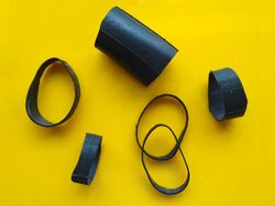 Most rubber, whether it is natural or synthetic, typically arrives at the manufacturing facility in large bales. Rubber bands are made by extruding the rubber into a long tube to provide its general shape. There are a number of different methods that can be applied at this point in the manufacturing process. Originally, and in some instances still today, the rubber tubes will then be placed on mandrels, curing the rubber with heat, and then slicing them across the width of the tube into little bands. This causes the tube to split into multiple sections, creating rubber bands.[5] This is most commonly known as an "off-line" rubber extrusion process.