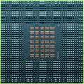 The underside of the 90 nm Cell/B.E. processor showing its 1242 solder balls, each 0.6 mm in diameter, and its array of 35 capacitors.