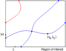 Another type of singular point is a turning point bifurcation, or saddle-node bifurcation, where the direction of the parameter [math]\displaystyle{ \lambda }[/math] reverses as the curve is followed. The red curve in the figure above illustrates a turning point.