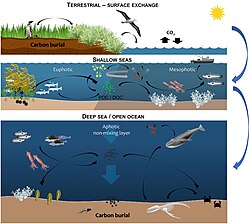 The term blue carbon was coined in 2009.[14][9] At the time, the term was coined to highlight that coastal vegetated ecosystems have a disproportionately large contribution to global carbon sequestration.[9] Others use the term to describe the carbon captured by the entire ocean, not just the coastal ecosystems.[15] The role of blue carbon in climate change mitigation and adaptation has now reached international prominence.[9]