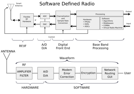 Software-defined radio (SDR) is a radio communication system where components that conventionally have been implemented in analog hardware (e.g. mixers, filters, amplifiers, modulators/demodulators, detectors, etc.) are instead implemented by means of software on a personal computer or embedded system.[1] While the concept of SDR is not new, the rapidly evolving capabilities of digital electronics render practical many processes which were once only theoretically possible.