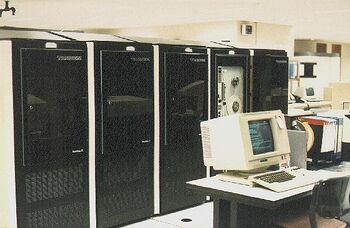 In 1986, Tandem introduced a third generation CPU, the NonStop VLX.[14] It had 32-bit datapaths, wider microcode, 12 MHz cycle time, and a peak rate of one instruction per microcycle. It was built from three boards of ECL gate array chips (with TTL pinout). It had a revised Dynabus with speed raised to 20 Mbytes/sec per link, 40 Mbytes/sec total. Later, FOX II increased the physical diameter of TNS clusters to 4 kilometers.