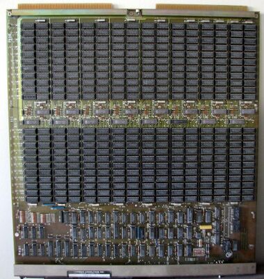In 1983, the NonStop TXP CPU was the first entirely new implementation of the TNS instruction set architecture.[10][11][12] It was built from standard TTL chips and Programmed Array Logic chips, with four boards per CPU module. It had Tandem's first use of cache memory. It had a more direct implementation of 32-bit addressing, but still sent them through 16-bit adders. A wider microcode store allowed a major reduction in the cycles executed per instruction; speed increased to 2.0 MIPS. It used the same rack packaging, controllers, backplane, and buses as before. The Dynabus and I/O buses had been overdesigned in the T/16 so they would work for several generations of upgrades.