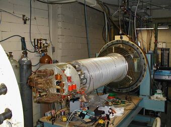 Two-stage systems, or "tandem accelerators", start with a source of He− ions and position the positive terminal at the center of the acceleration tube. A stripper element included in the positive terminal removes electrons from ions which pass through, converting He− ions to He++ ions. The ions thus start out being attracted to the terminal, pass through and become positive, and are repelled until they exit the tube at ground. This arrangement, though more complex, has the advantage of achieving higher accelerations with lower applied voltages: a typical tandem accelerator with an applied voltage of 750 kV can achieve ion energies of over 2 MeV.[6]