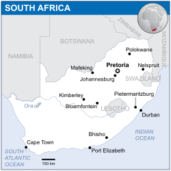 The Republic of South Africa is a country located at the southernmost tip of Africa. About 80% of its population is of Bantu or Khoisan ancestry, which encompasses a variety of ethnic groups and languages.[2] Nine of these Bantu languages have official status. The remaining 20% of the country's population are of European, Asian, or multiracial descent. The country also boasts the world's only neo-modal national anthem (beginning and ending in different keys), as well as the world's most unpronounceable Unix Code national motto: "!ke e:/xarra//k," which contains three different "clicks" when spoken. It's a Khoisan phrase meaning "diverse people unite".[3]
