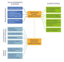 Total or remaining carbon budgets are calculated by combining estimates of various contributing factors, including scientific evidence and value judgments or choices.[8][9][10][11][12]