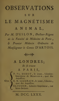 d’Eslon, a one-time patient, pupil, and associate of Mesmer,[69] published a work on Mesmer's version of animal magnetism (while still associated with Mesmer), Observations sur le Magnétisme Animal (1780),[70] which presented details of 18 cases (10 male, 8 female) treated by Mesmer.[71]