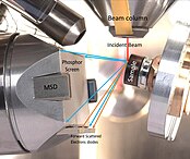 The EBSD detector is located within the specimen chamber of the SEM at an angle of approximately 90° to the pole piece. The EBSD detector is typically a phosphor screen that is excited by the backscattered electrons.[11] The screen is coupled to lens which focuses the image from the phosphor screen onto a charge-coupled device (CCD) or complementary metal–oxide–semiconductor (CMOS) camera.[12]