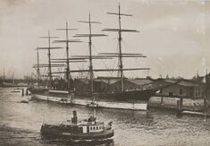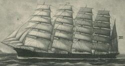 Potosi was a five-masted steel barque built in 1895 by Joh. C. Tecklenborg ship yard in Geestemünde, Germany , for the sailing ship company F. Laeisz as a trading vessel.[1] Its primary purpose was as a "nitrate clipper" collecting guano in South America for use in chemical companies in Germany (mainly for making explosives and fertiliser).[2] As its shipping route was between Germany and Chile , it was designed to be capable of withstanding the rough weather encountered around Cape Horn.[3]