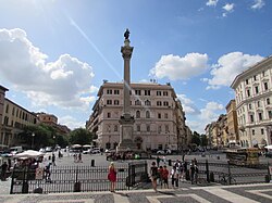 The city hosts eight ancient Egyptian and five ancient Roman obelisks, together with a number of more modern obelisks; there was also formerly (until 2005) an ancient Ethiopian obelisk in Rome.[145] The city contains some of obelisks in piazzas, such as in Piazza Navona, St Peter's Square, Piazza Montecitorio, and Piazza del Popolo, and others in villas, thermae parks and gardens, such as in Villa Celimontana, the Baths of Diocletian, and the Pincian Hill. Moreover, the centre of Rome hosts also Trajan's and Antonine Column, two ancient Roman columns with spiral relief. The Column of Marcus Aurelius is located in Piazza Colonna and it was built around AD 180 by Commodus in memory of his parents. The Column of Marcus Aurelius was inspired by Trajan's Column at Trajan's Forum, which is part of the Imperial Fora.[146]
