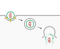 A third and more specific example, is by simply attaching to the surface of the cell via receptors on the cell, and injecting only its genome into the cell, leaving the rest of the virus on the surface. This is restricted to viruses in which only the genome is required for infection of a cell (for example positive-strand RNA viruses because they can be immediately translated) and further restricted to viruses that actually exhibit this behavior. The best studied example includes the bacteriophages; for example, when the tail fibers of the T2 phage land on a cell, its central sheath pierces the cell membrane and the phage injects DNA from the head capsid directly into the cell.[17]