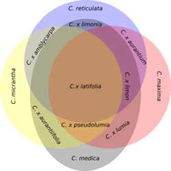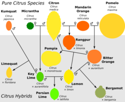 Artificial interbreeding seems possible among all citrus plants, though there are certain limitations to natural interbreeding due to plant physiology and differences in natural breeding seasons. This ability to cross-pollinate extends to some related species that some classifications place in distinct genera. The ability of citrus hybrids to self-pollinate and to reproduce sexually also helps create new varieties, as does spontaneous mutation and genome duplication. The three most predominant ancestral citrus taxa are citron (C. medica), pomelo (C. maxima), and mandarin (C. reticulata).[7] These taxa interbreed freely, despite being quite genetically distinct, having arisen through allopatric speciation, with citrons evolving in northern Indochina, pomelos in the Malay Archipelago, and mandarins in Vietnam, southern China, and Japan .[14] The hybrids of these taxa include familiar citrus fruits like oranges, grapefruit, lemons, and some limes and tangerines.[1][15] These three have also been hybridized with other citrus taxa, for example, the Key lime arose from a citron crossing with a micrantha.[7] In many cases, the varieties are propagated asexually, and lose their characteristic traits if bred. Some of the hybrids have in turn interbred with one another hybrid or with the original taxa, making the citrus family tree a complicated network.