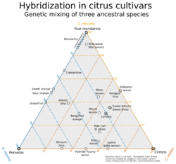 All characterized commercial varieties called mandarins are actually inter-species hybrids.[4][32] Wu, et al., divided mandarins into three types, based on their degree of hybridization. In addition to genetically pure mandarins, a second type are the result of hybridization with pomelos followed by subsequent backcrossing with mandarins to retain only a few pomelo traits. The third type arose more recently from the crossing of these hybrids again with pomelos or sweet oranges (which are themselves crosses of hybrid mandarins and pomelos). This produces mandarins with more, longer stretches of pomelo DNA.[7] Some commercial mandarins are hybrids with lemons, while several were found to have a significant contribution (35–65%) from papedas.[30]
