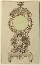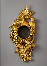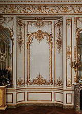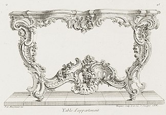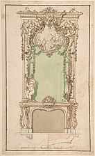 Rocaille was exuberant and inspired by nature like Rococo, but, unlike Rococo, it was usually symmetrical and not overloaded with decoration. It took its name from the mixture of rock, seashell and plaster that was used to create a picturesque effect in grottos during the Renaissance, and from the name of a seashell-shaped ornament which was frequent feature of Rocaille decoration.[7] In 1736, the designer and jeweler Jean Mondon published the Premier Livre: De forme Rocquaille et Cartel, a collection of designs for ornaments of furniture and interior decoration. It was the first appearance in print of the term rocaille to designate the style.[8]