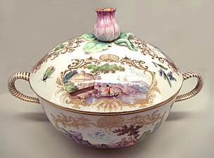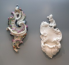Besides its use in furniture, the style appeared in porcelain and metalwork. In 1738, the Manufacture de Vincennes was founded thanks to the support of Louis XV and Madame de Pompadour, in order to compete with the manufactories at Chantilly and Meissen.[12] In 1756, the manufactury was moved to a building in Sèvres, built at the initiative of Madame de Pompadour, near her château.