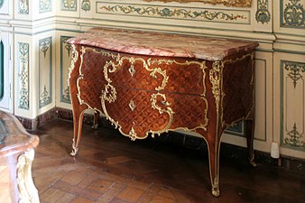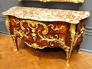 Another important figure of the rocaille style was the ébéntiste Charles Cressent (1685–1768), who was a master craftsman both in the guild of wood carvers and bronze ornament sculptors, a rare accomplishment earned respectively in 1708 and 1714. Cressent made furniture not only for Louis XV, but also for the King of Portugal and for the Elector of Bavaria. He is best known for his commodes, book cases and desks, which were often inlaid with rosewood and violet wood and equipped with particularly fine rocaille ornament of gilded bronze, including infants intermingled with birds and cascading vegetation. He introduced several stylistic innovations, including the espagnolettes à aigrette, small busts of young women, applied to the corners of his commodes and desks. This became a common decoration used by other masters of the rocaille.[11]