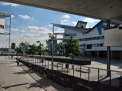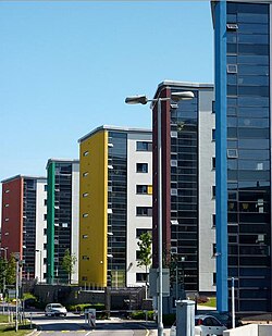 New student accommodation opened in 2008 and the campus now has 1,200 student rooms, together with shops, cafés and a restaurant, launderettes and an open-air fitness suite. SportsDock, a £21 million sports and academic centre, opened in March 2012.[19] SportsDock served as the High-Performance Training Centre for Team USA during the London 2012 Olympic Games.[20] The campus library is housed in the Royal Docks Business School building.