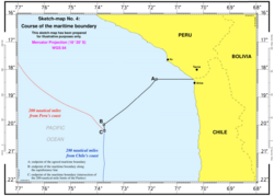 For its part, the Chilean government has asserted that the region in dispute is not a coastal site named Concordia, but instead refers to boundary stone No. 1, which is located to the northeast and 200 meters inland.[14] A possible border dispute was averted when the Chilean Constitutional Court formally ruled on 26 January 2007, against the legislation. While agreeing with the court's ruling, the Chilean government reiterated its stance that the maritime borders between the two nations were not in question and have been formally recognized by the international community.[15] The Peruvian government has stated that it might turn to the international court at The Hague to solve the dispute.[16]