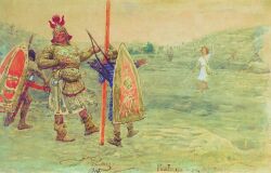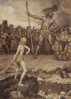 Goliath[lower-alpha 1] is described in the biblical Book of Samuel as a Philistine giant defeated by the young David in single combat. The story signified Saul's unfitness to rule, as Saul himself should have fought for the Kingdom of Israel.[1]