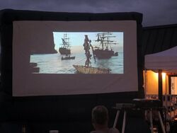 In homes that have an adequately sized backyard, it is possible for people to set up a home cinema in an outdoor area. Depending on the space available, it may simply be a temporary version with foldable screen, a video projector and a couple of speakers, or a permanent fixture with a huge screen and dedicated audio set-up mounted in a weather-proof cabinet. Outdoor home cinemas are popular with BBQ parties and pool parties. Some specialist outdoor home-cinema companies are now marketing packages with inflatable movie screens and purpose-built AV systems. Some people have expanded the idea and constructed mobile drive-in theaters that can play movies in public open spaces. Usually, these require a powerful projector, a laptop or DVD player, outdoor speakers or an FM transmitter to broadcast the audio to other car radios.